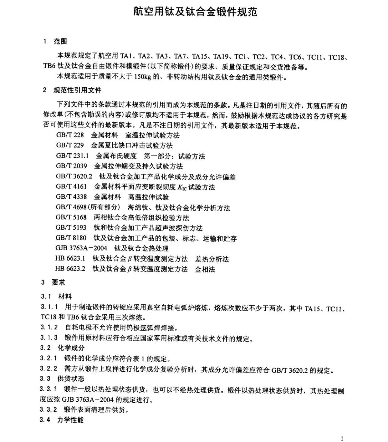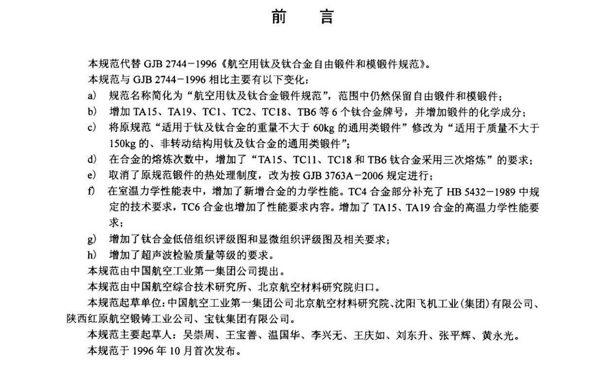 本規(guī)范規(guī)定了航空用TA1、TA2、TA3、TA7、TA15、TA19、TC1、TC2、TC4、TC6、TC11、TC18、TB6鈦及鈦合金自由鍛件和模鍛件(以下簡(jiǎn)稱鍛件)的要求、質(zhì)量保證規(guī)定和交貨準(zhǔn)備等。