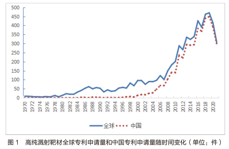 本文主要研究高純?yōu)R射靶材全球?qū)@暾?qǐng)狀況及其技術(shù)進(jìn)展,數(shù)據(jù)檢索選用中國(guó)專利文摘數(shù)據(jù)庫(CNABS)和德溫特世界專利索引數(shù)據(jù)庫(DWPI)。通過關(guān)鍵字和分類號(hào)在數(shù)據(jù)庫中檢索獲得初步結(jié)果,通過瀏覽配合分類號(hào)去除明顯噪聲。數(shù)據(jù)檢索截止時(shí)間為2021 年12 月31 日。